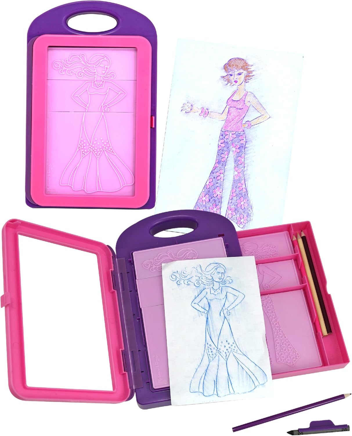 - 16 pieces include 9 double-sided, textured fashion plates, 4 pencils, 1 crayon, crayon holder, and storage case