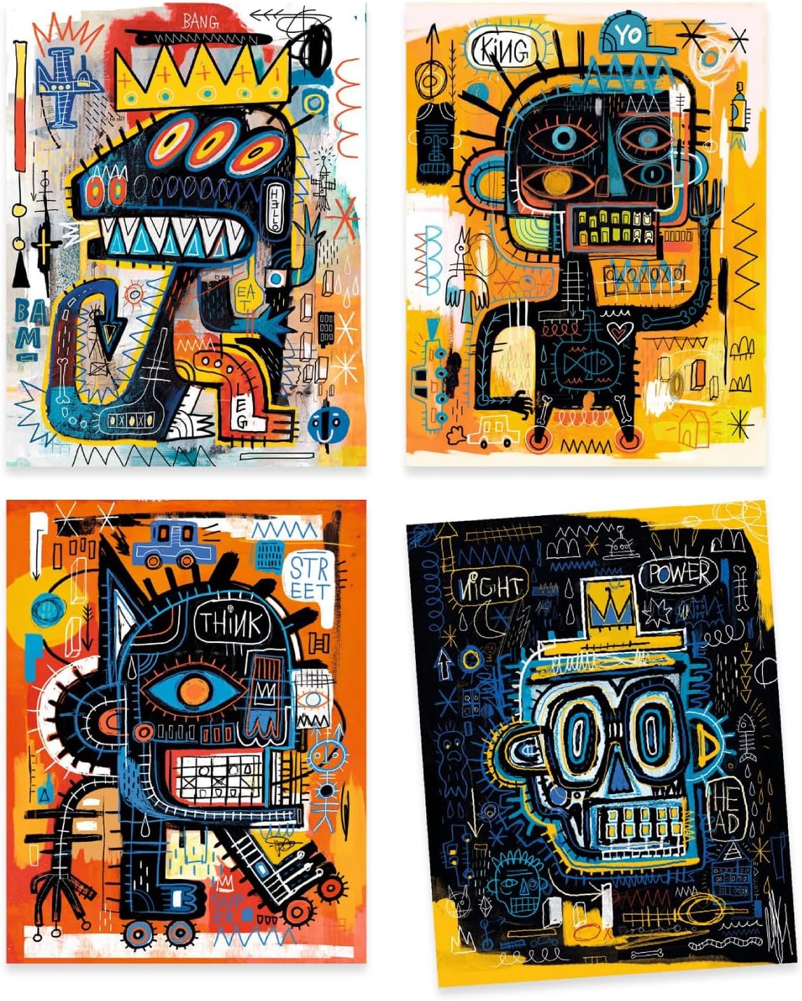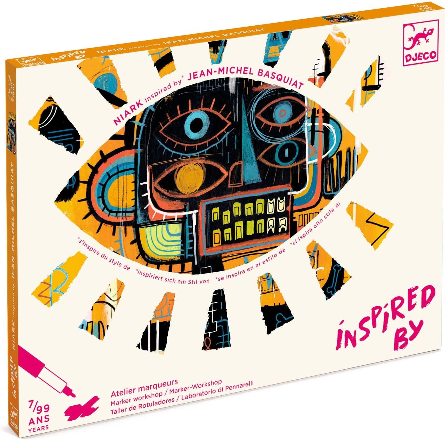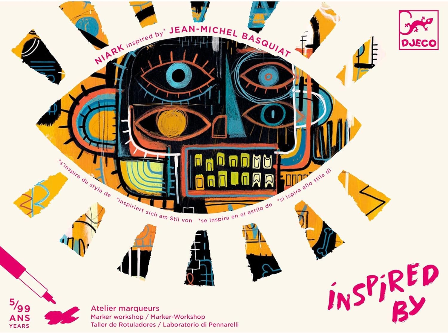 4 pictures dreamt up by Niark to complete using opaque markers. Discover the world of street art Basquiat-style: an organised mess, and lots of fun!